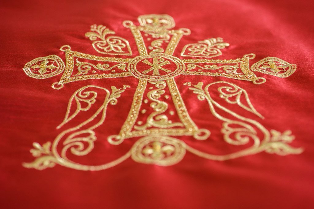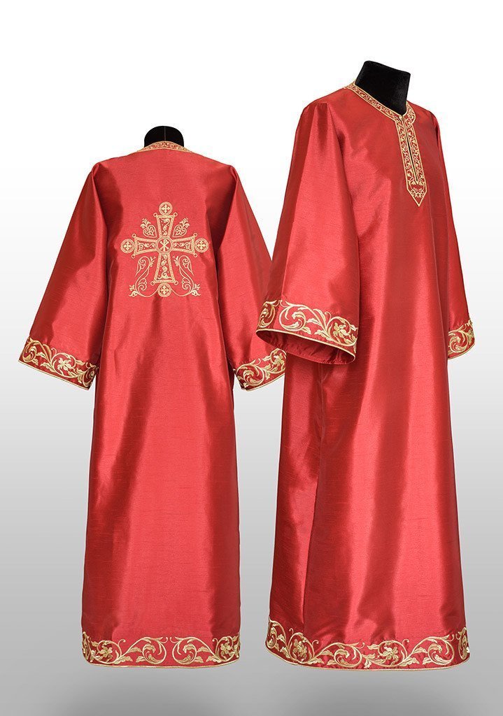 The tunics are available in the Dechani style only and are made of poly silk shantung. They feature a richly embroidered and beaded cross on the back and embroidery on the neckline, sleeves and hem.