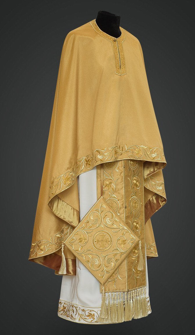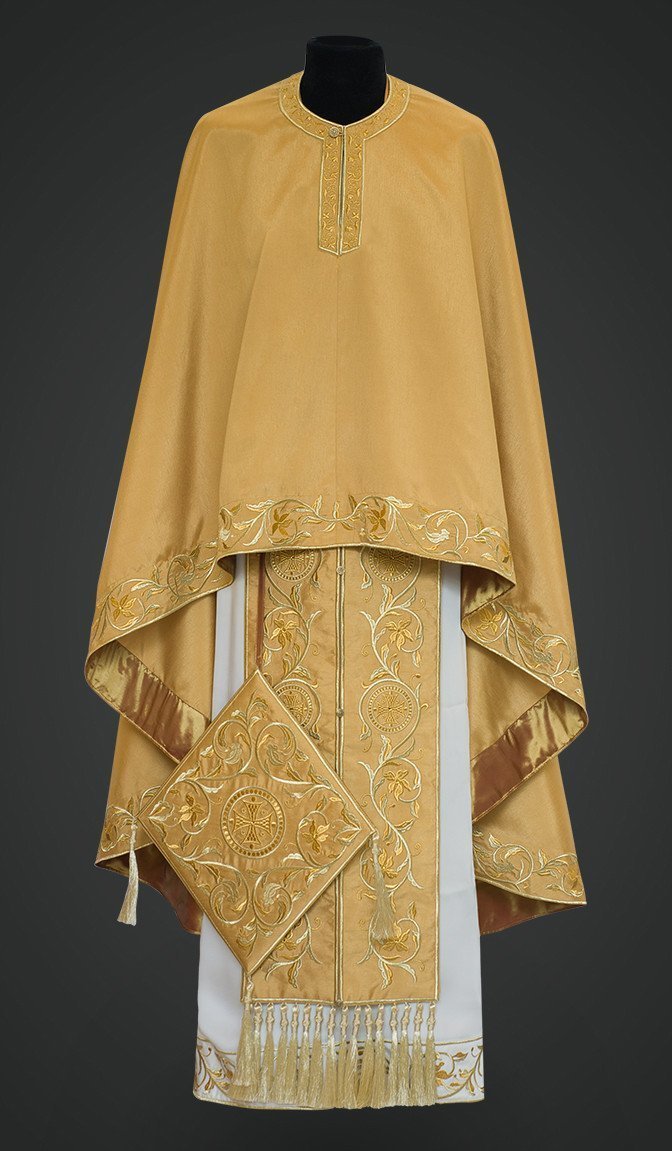 The set of vestments for priests includes: stiharion, epigonation, stole, cuffs, felonion and belt.